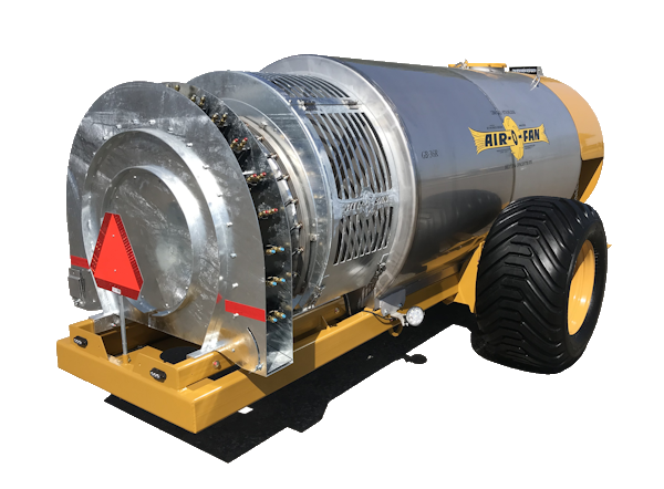 The Air-O-Fan "Reverse Fan" GB-36R "Volute Tower" vineyard sprayers out perform, and out last the competition. Other manufacturers have tried to duplicate our towers without success. The "Reverse Fan" models reduce the amount of leaves and dirt that normally plug the fan guard and housing. Fan life in sandy soil vineyards far exceeds conventional fan housings. Serviceability is made easier with larger guards and inspection covers. The amount of controllable air volume enables the operator to spray effectively throughout the growing season in most applications. Controllable air and direct coverage reduces drift and saves time and chemicals. The GB-36R "Reverse Fan" vineyard sprayers combine performance and simplicity, and can be used in both concentrate and dilute applications. The "Reverse Fan" models come standard with our DK turning hitch and are also available with our 2-point turning hitch option, indented tank option for narrow rows, and our Myers© 2-stage centrifugal pump option.